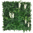 Artificial green wall mixed plant panel with variegated green foliage including ivy, grasses and ferns and beautiful delicate cream trailing Wisteria flowers. Realistic , durable artificial plant panels with an amazing 3D effect. There are 6 Wisteria flowers per 1m2 panel.