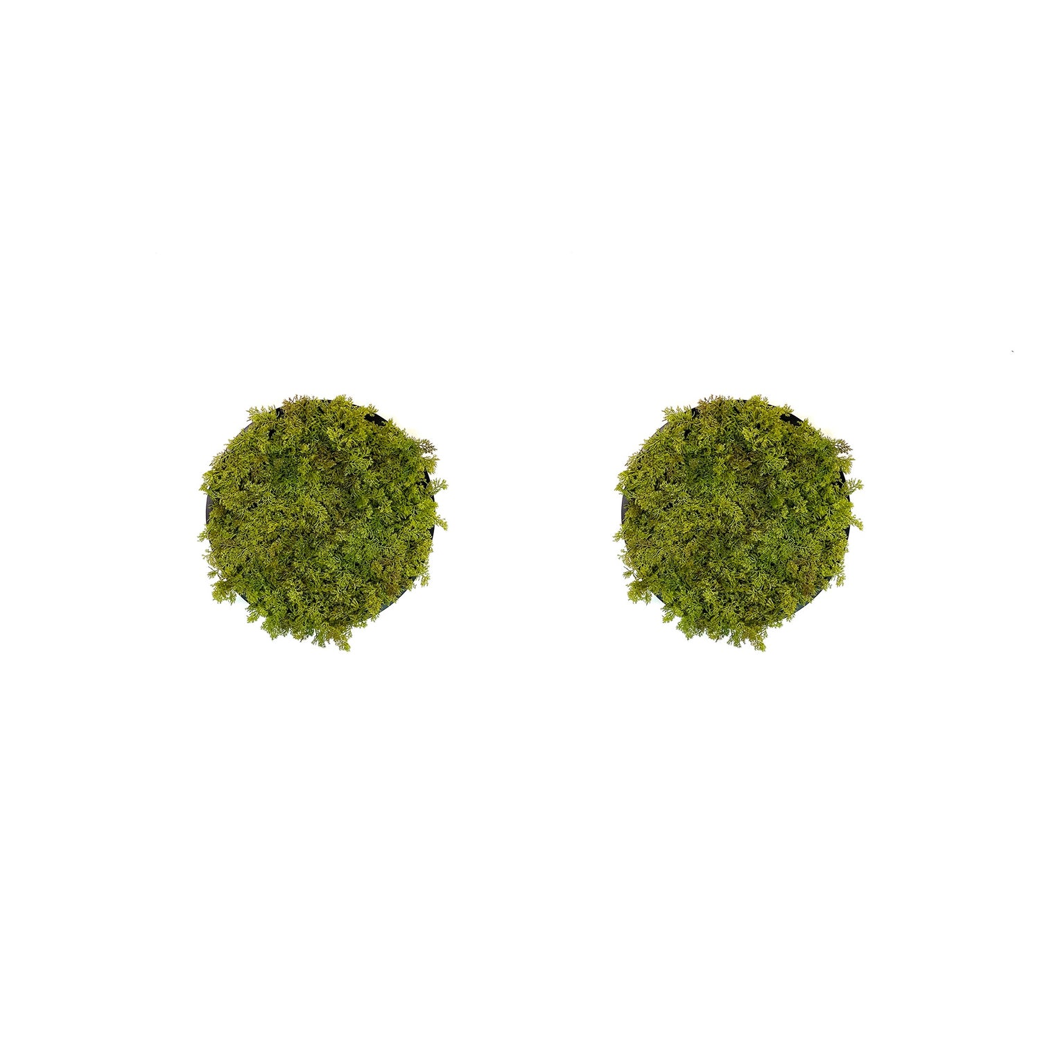 This is a set of 2 x 30cm artificial reindeer moss frames art panels in a black circular MDF frame.The discs can be hung in a set or multiple sets across a wall to make a stunning wall feature.