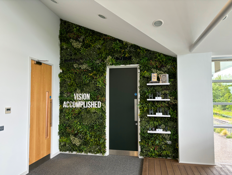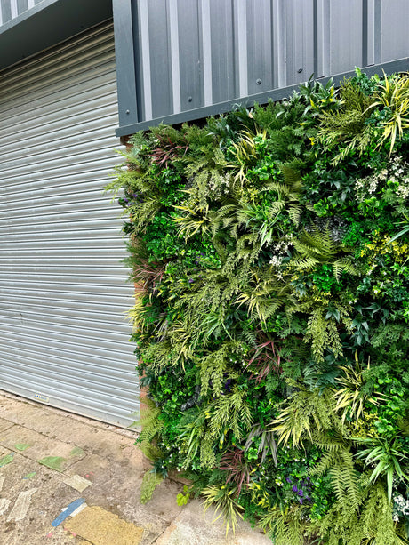 Artificial green wall panel with variegated foliage and pink trailing sweet peas 100x100 cm