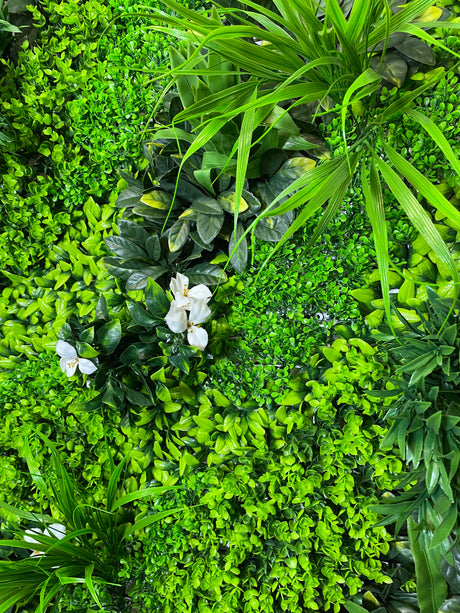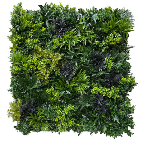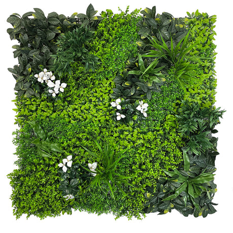 Artificial green wall panel with variegated foliage and purple orchids 100x100 cm