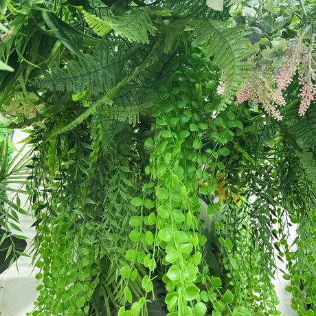 Artificial green wall panel with variegated foliage and trailing pink flowers 100x100 cm