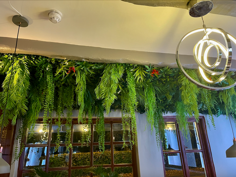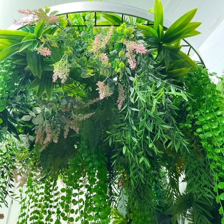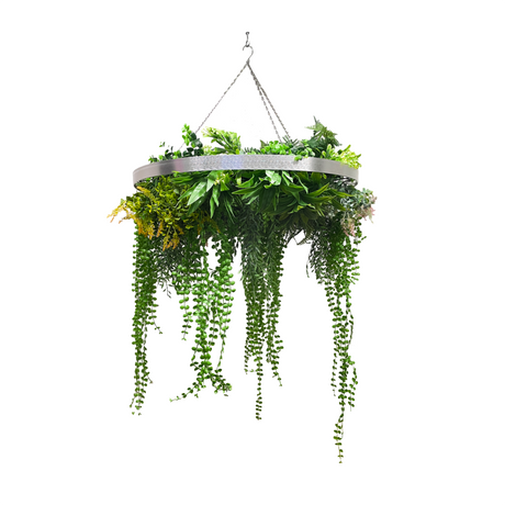 Hanging hoop with a mixture of artificial green plants with yellow flowers 80cm diameter