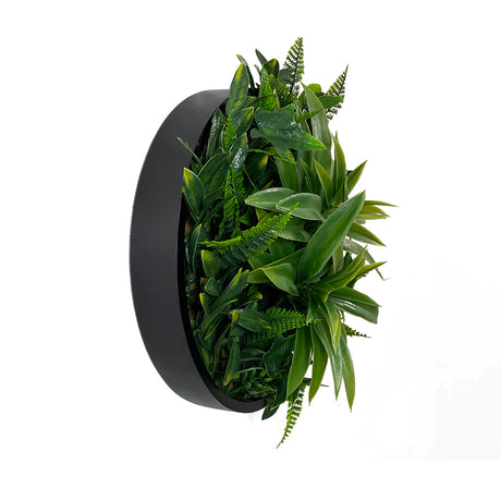 Artificial green foliage wall circular art panel 50 cm black aluminium