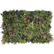 The ultra realistic artificial plant green wall panels are made of full headed bushes of rue and ostrich ferns, red, purple ,white, yellow and green australis, jade grassula, cedar, green buxus, white flowering scandix, purple-red tipped javanica, lime greenJapanese privet and purple-green tipped buxus.
